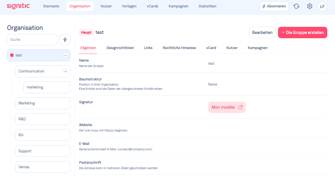 Tipp:Um Signitic so weit wie möglich zu automatisieren, empfehlen wir Ihnen, alle Informationen zu Ihrer Hauptgruppe im Voraus auszufüllen, damit das Konzept der Vererbung auf Ihre Level-2- und Level-3-Gruppen angewendet werden kann.