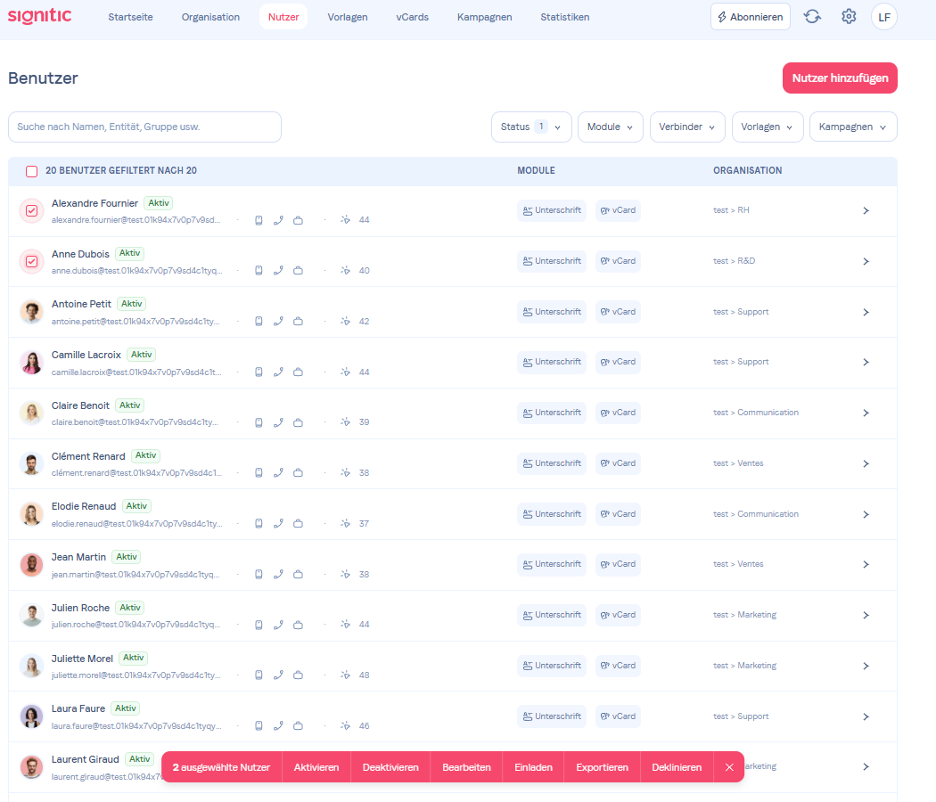 In Signitic können Sie alle Ihre Mitarbeiter mit der Sammelaktionen-Schaltfläche verwalten.