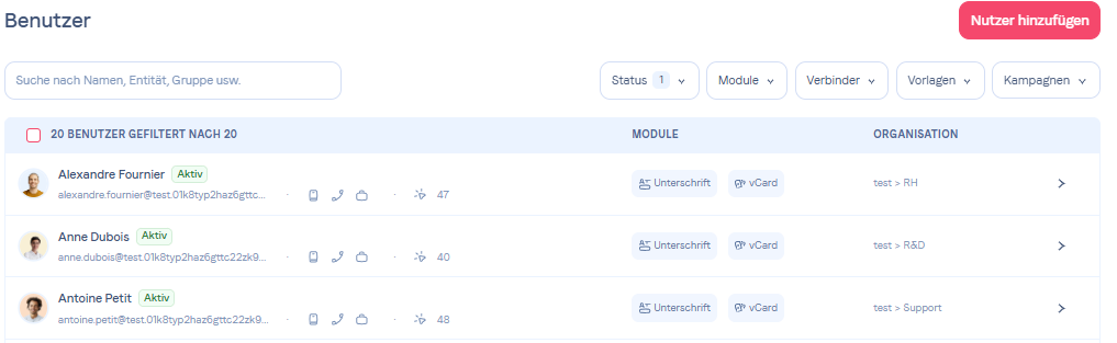 Um die Delegation eines Benutzers zu aktivieren, gehen Sie zur Benutzerakte der Person, deren Signatur Sie freigeben möchten.