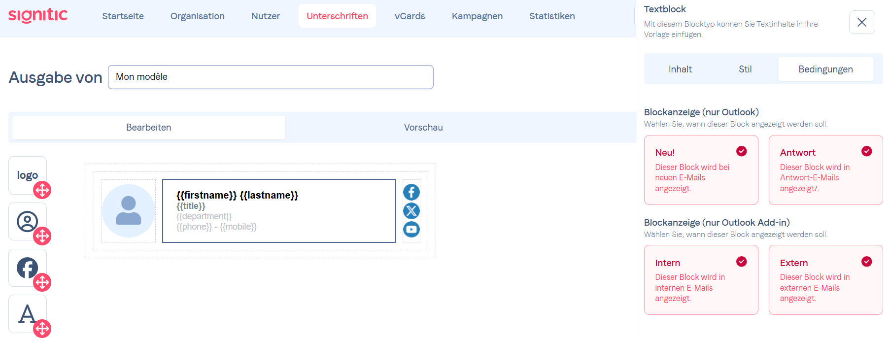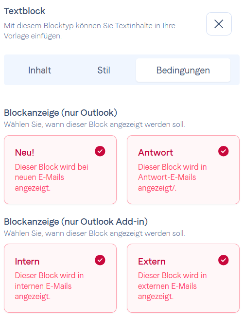 Im Vorlagen-Editor hat jeder Block ein Bedingungen Menü, in dem Sie Bedingungen für die Anzeige des Blocks auswählen können.