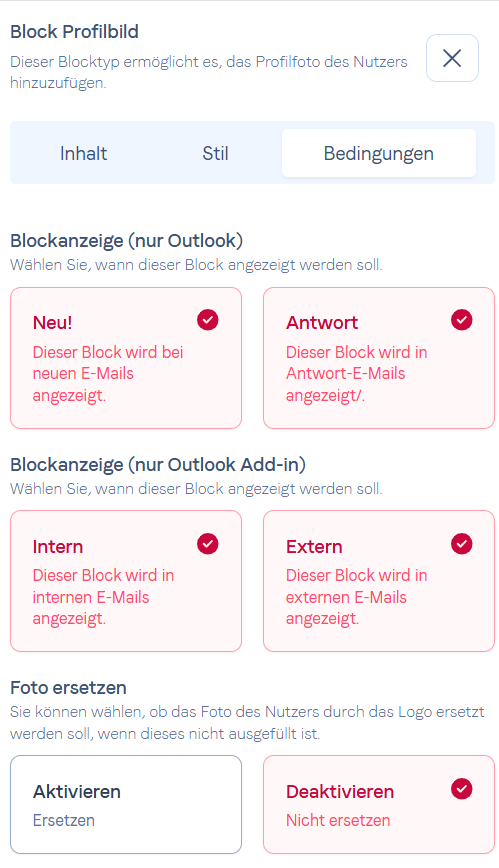 Sie haben die Möglichkeit, die Ersetzen-Option auszuwählen, wenn Ihr Benutzer kein Foto hat. In diesem Fall wird das Foto durch das Firmenlogo ersetzt.