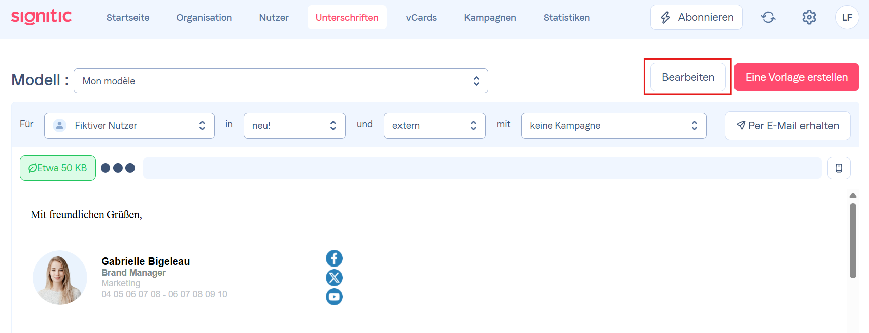 Im Vorlagenmenü wählen Sie die gewünschte Signaturvorlage aus und klicken Sie auf Bearbeiten.