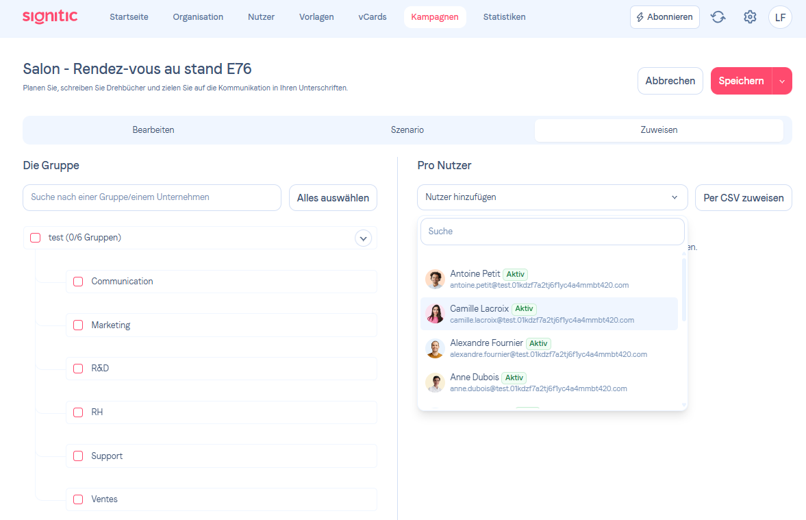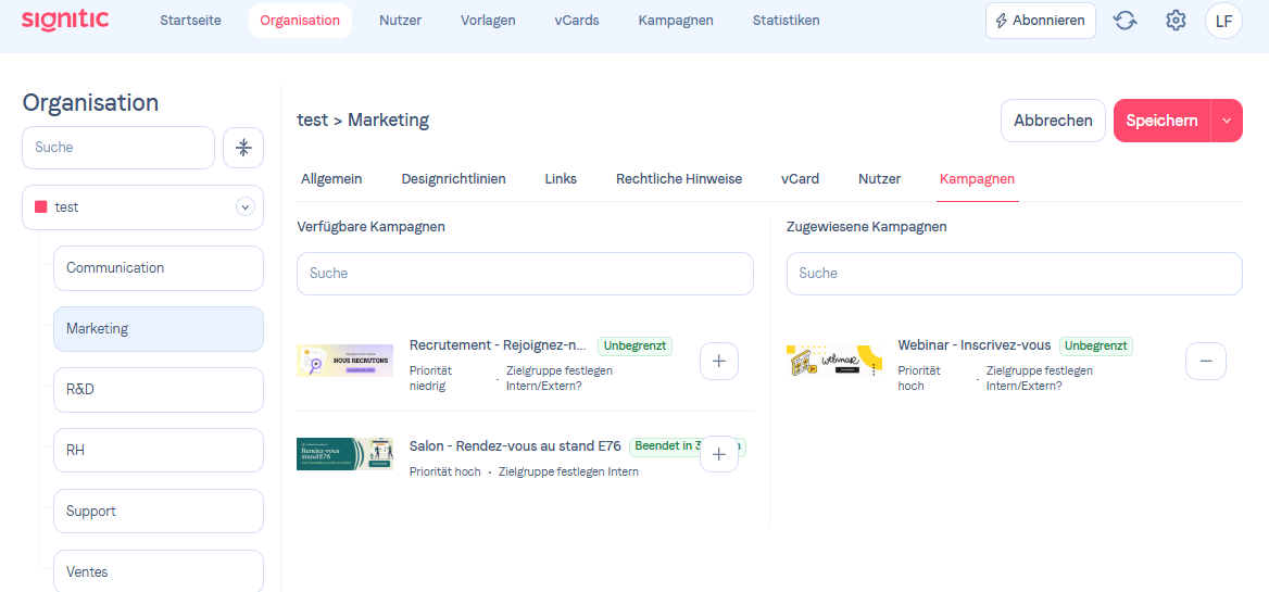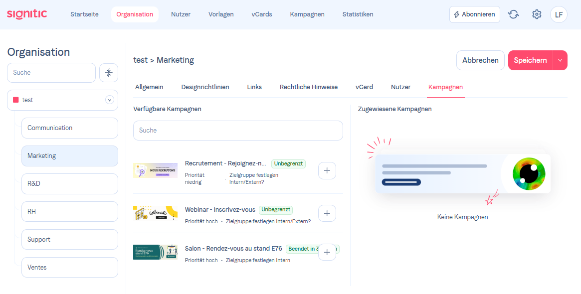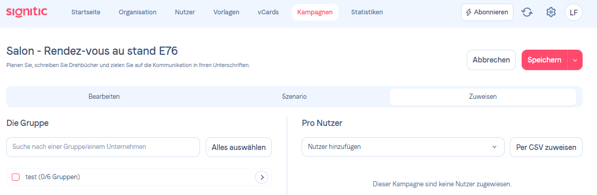Um Ihre Nachrichten gezielt zu adressieren in Ihren Signaturen, können Sie Kampagnen zuweisen an bestimmte Benutzer oder Benutzergruppen.