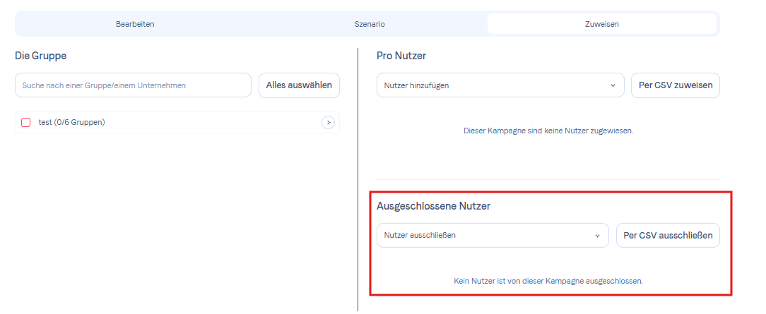 Hier können Sie die genaue Liste der Benutzer auswählen, die Ihrer Kampagne zugewiesen werden. Entweder nach Gruppe (2) oder nach Benutzer (3).