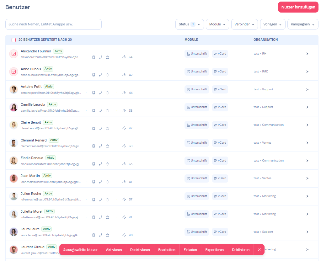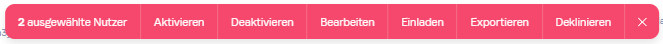 Greifen Sie auf das0 Benutzermenü zu, und wählen Sie Ihre Benutzer mit Hilfe der Kontrollkästchen links von jedem Benutzer oder filtern Sie sie mit den verfügbaren Filtern oben auf der Seite.