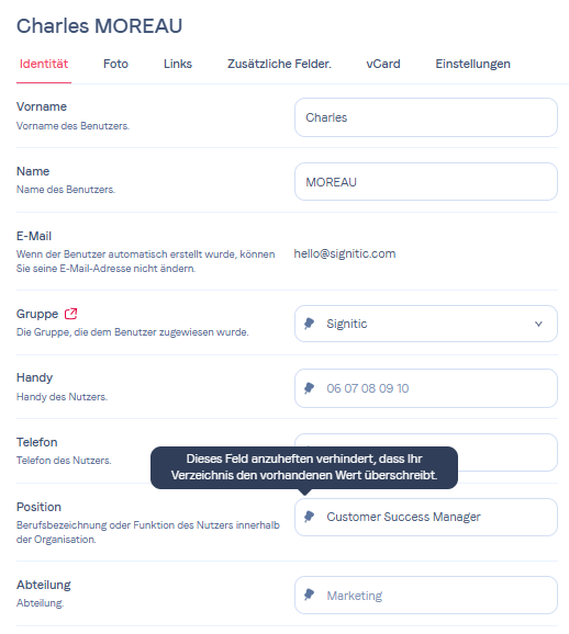 Wenn Ihr Konto vollständig mit Ihrem Verzeichnis synchronisiert ist und die Option „Datenüberschreibung“ aktiviert wurde, können Sie bestimmte Felder gezielt von der täglichen Aktualisierung der Benutzerdaten ausnehmen.
