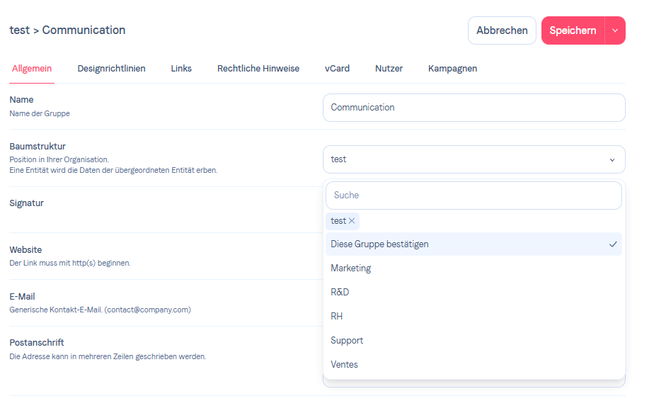 Ihre Gruppen spiegeln verschiedene Hierarchieebenen wider. Beispielsweise können Sie eine Hauptgruppe haben, gefolgt von einer spezifischen Einheit und dann Diensten innerhalb dieser Einheit wie Personalwesen, Vertrieb usw.