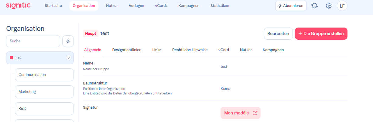 Dieser Artikel erklärt Ihnen, wie Sie Ihre Gruppe im Reiter Organisation erstellen, um alle von Signitic angebotenen Funktionen optimal zu nutzen.