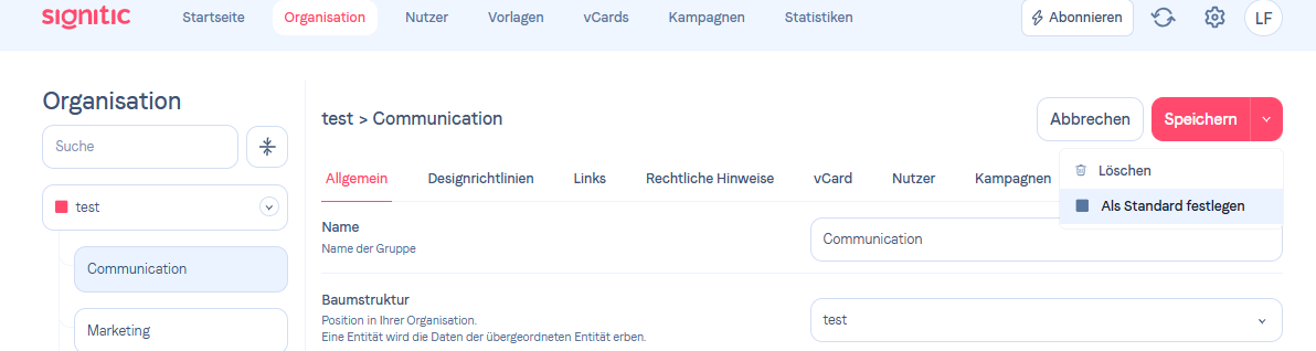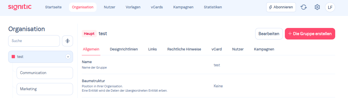 Eine Standardgruppe festlegenUm diese Aktion durchzuführen, können Sie den Reiter Organisation in Signitic aufrufen.