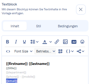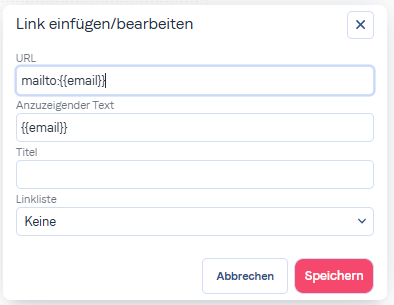 Wählen Sie das Attribut {{email}} aus und klicken Sie anschließend auf die Büroklammer, um den Link für Ihre Attribute anzugeben.