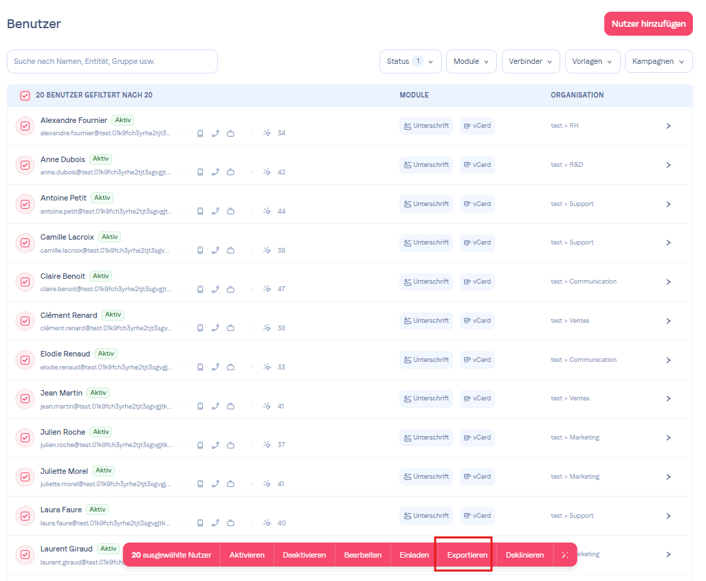In Signitic haben Sie die Möglichkeit, Benutzer nicht nur per CSV-Datei zu importieren, sondern auch zu exportieren, um wichtige Informationen jedes einzelnen Nutzers zu erhalten.