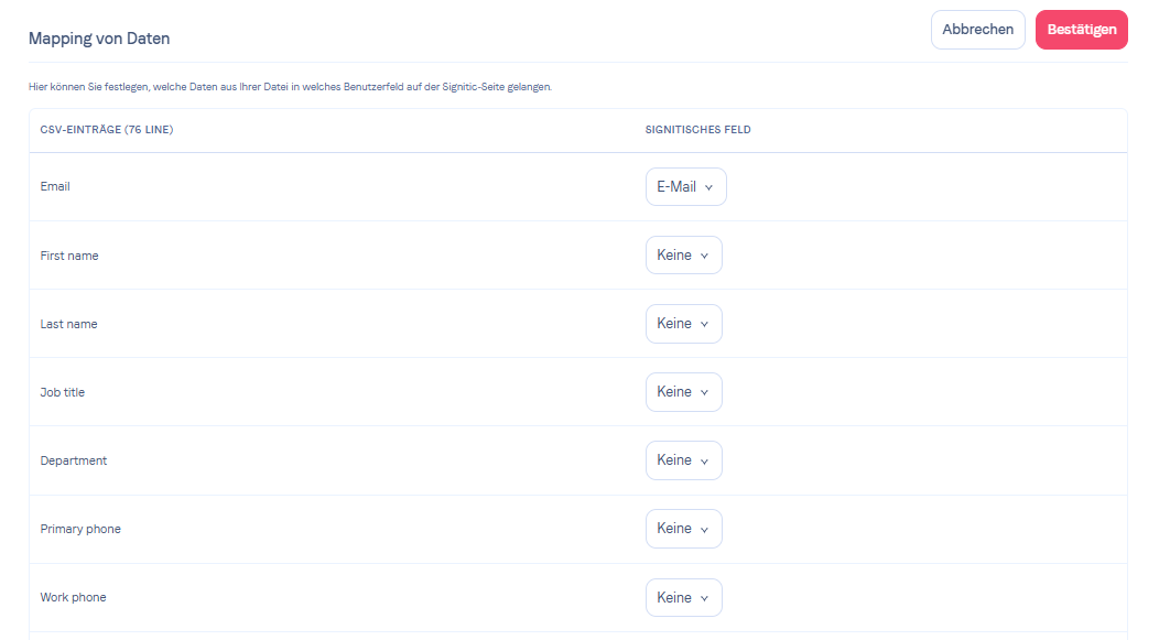 Importieren Sie Ihre CSV-Datei in SigniticSobald Ihre CSV-Datei bereit ist. Lesen Sie diesen Artikel, um zu verstehen, wie Sie Ihre Datei aus dem Tab "Benutzer" in Signitic importieren können.