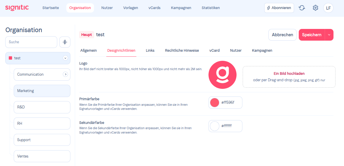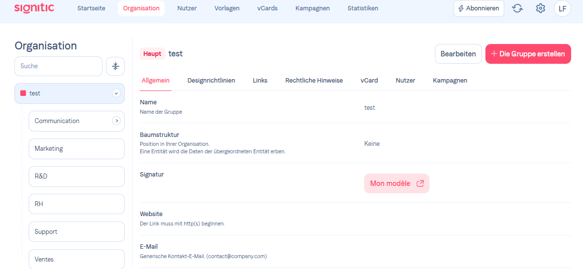 Fügen Sie Ihr Logo hinzuGehen Sie zum Tab "Organisation" in Ihrem Signitic-Konto und wählen Sie die Gruppe aus, die Sie bearbeiten möchten.