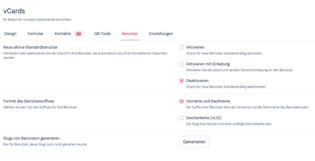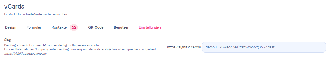Sobald Sie das Modul aktiviert haben, können Sie den Slug Ihrer vCards im Untertab Einstellungen verwalten. Zum Beispiel: https://signitic.cards/meinefirma