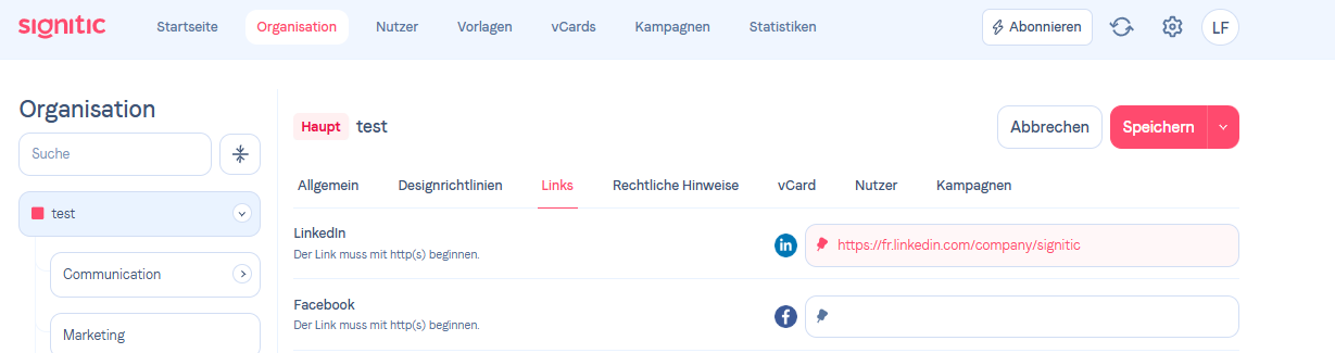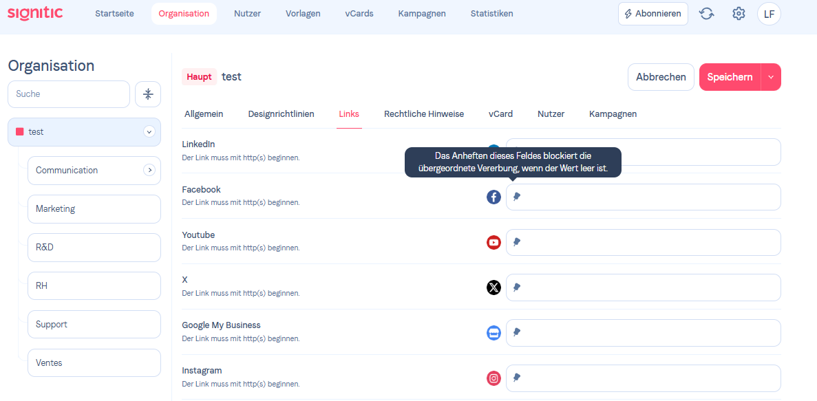 Auf Signitic können Sie Links zu jeder Ihrer Gruppen hinzufügen, wenn diese zum Beispiel unterschiedliche Marken repräsentieren. In dieser Situation gibt es ein Konzept der Vererbung, das es Ihnen ermöglicht, die Links Ihrer Gruppe auf Ebene 1 zum Beispiel auf Ihre Gruppen der Ebenen 2 oder 3 zu übertragen. (Vererbung von Elterndaten)