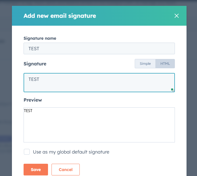 - Erstellen Sie eine HTML-Signatur in Hubspot. Die Erweiterung ersetzt eine bereits vorhandene Signatur, erstellt jedoch keine neue. Um dies zu umgehen, müssen Sie daher eine HTML-Signatur in Hubspot erstellen und die Erweiterung neu starten.