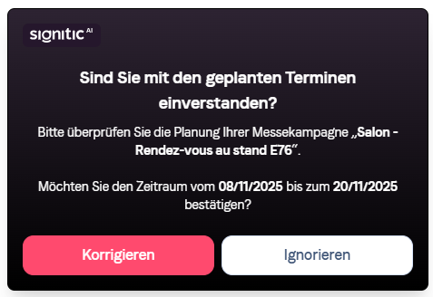 Eine intelligente Erinnerung an die Zuweisung der KampagneIhr Assistent erkennt automatisch falsch zugewiesene oder nicht verlinkte Kampagnen. Er warnt Sie proaktiv, damit Ihre Kommunikation nicht in Vergessenheit gerät. Diese Erinnerung wird direkt in Ihre Signitic-Oberfläche integriert und erscheint als klare und umsetzbare Empfehlung.