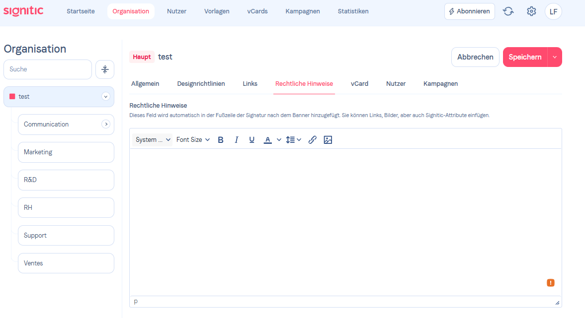 Greifen Sie auf den Unterreiter "Rechtliche Hinweise" direkt unter Ihrer Organisation.Passen Sie die Darstellung an