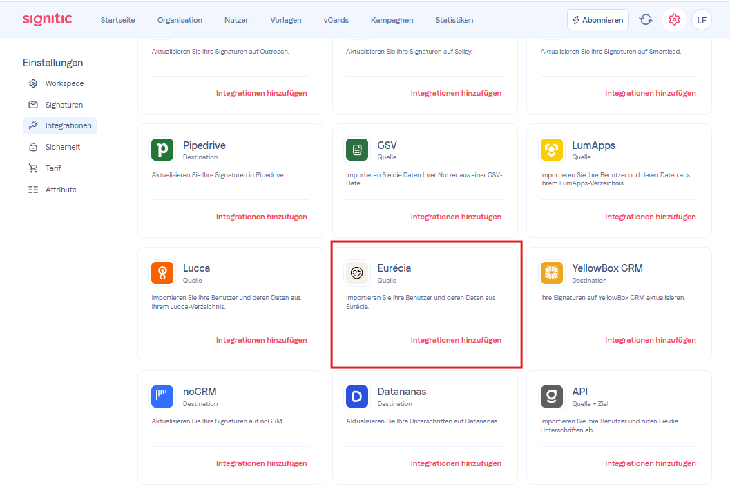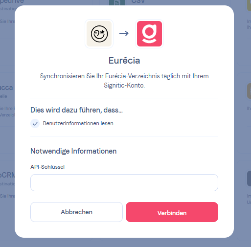 Um von Ihren in Ihrem Eurécia-Verzeichnis vorhandenen Daten zu profitieren, verfügt Signitic über eine Integration, deren Installation nur wenige Klicks erfordert.