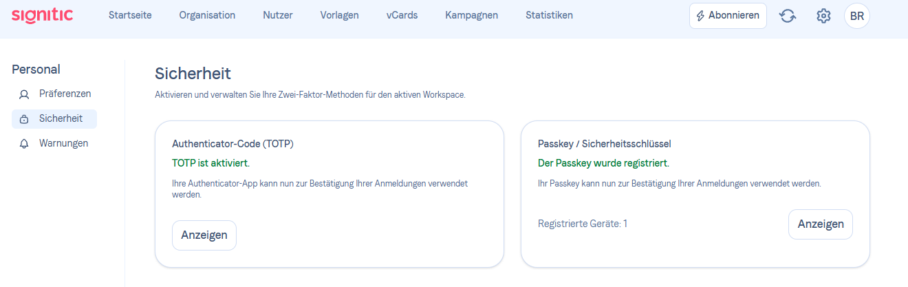 In der Karte "Passkey / Sicherheitsschlüssel" klicken Sie auf Anzeigen , um Ihre registrierten Geräte hinzuzufügen oder zu verwalten.