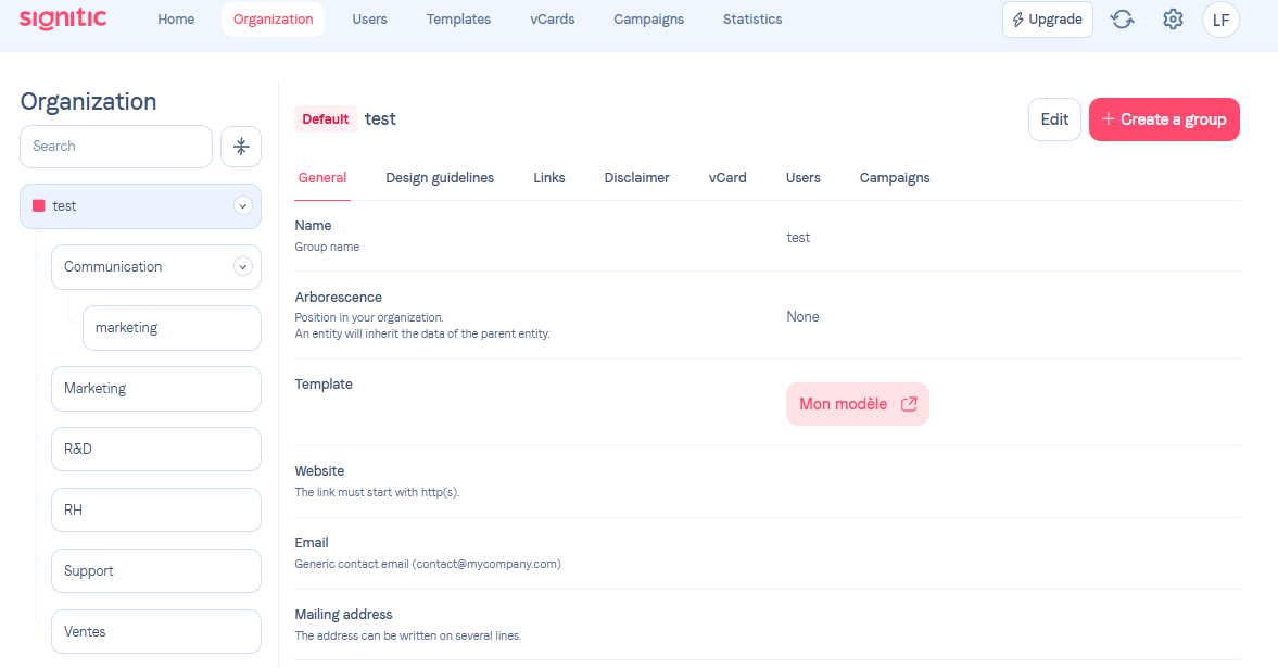 Tip:In order to automate Signitic as much as possible, we advise you to fill in all the information relating to your main Group beforehand, so that the notion of inheritance can be applied to your level 2 and 3 groups.