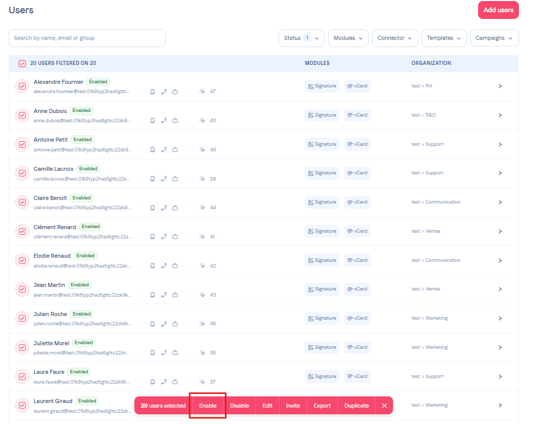 Go to the Users menuAccess the Users menu, then select your users using the checkboxes to the left of each user or filter them using the available filters at the top of the page.