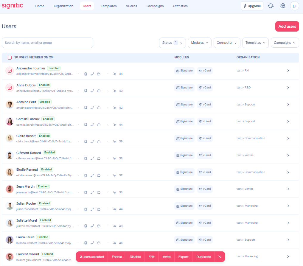 From Signitic, you can manage all your collaborators using the bulk actions button.