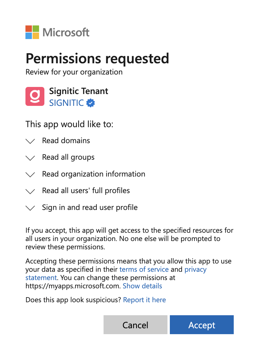 Select Microsoft 365 then Connect, in order to be redirected to the acceptance page for the different permissions.