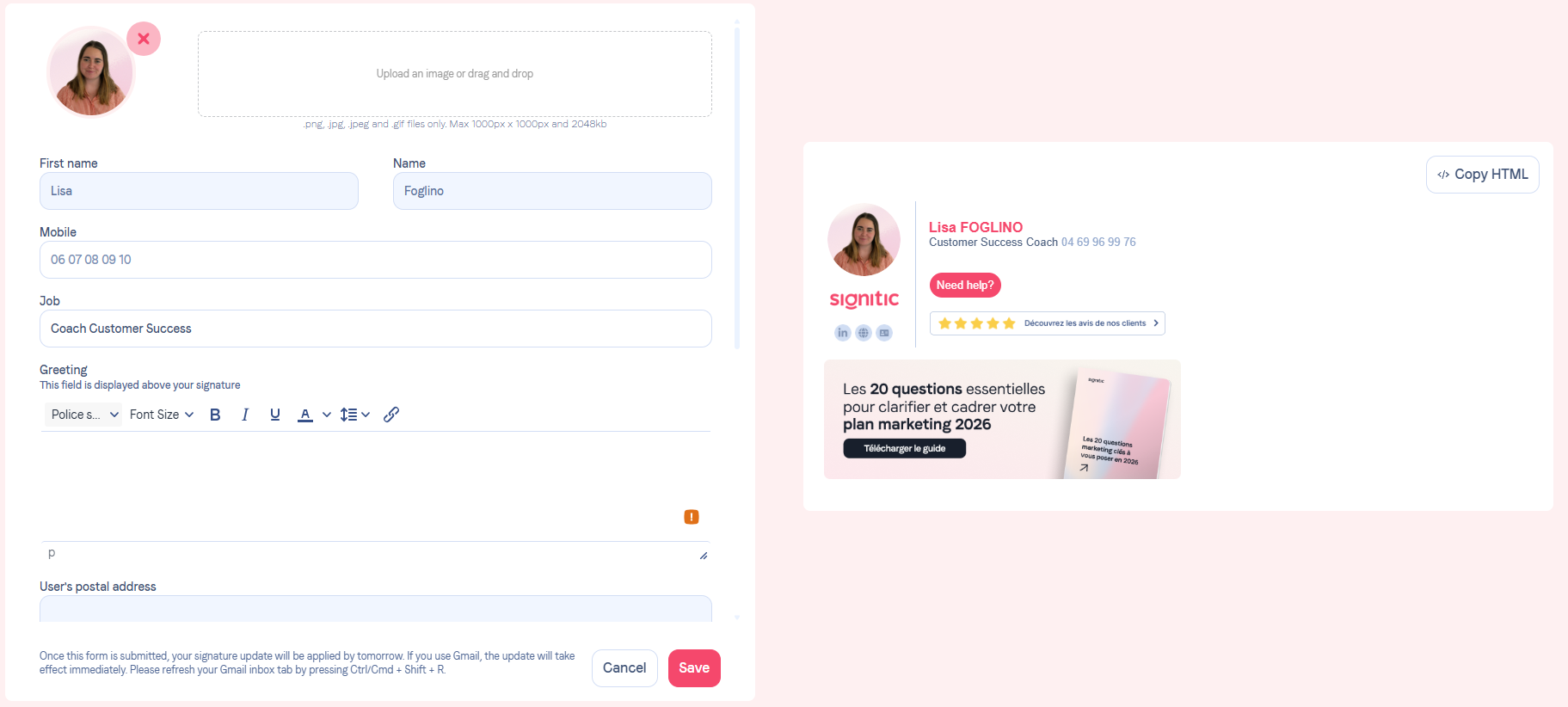 Change your photo from the formTo get started, follow this link https://app.signitic.com/public/informations where you will see a section dedicated to uploading your photo. This section looks like a frame outlined with dashes or indicating "Upload Drag and drop your photo here".