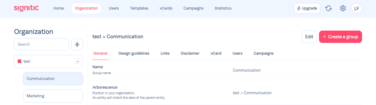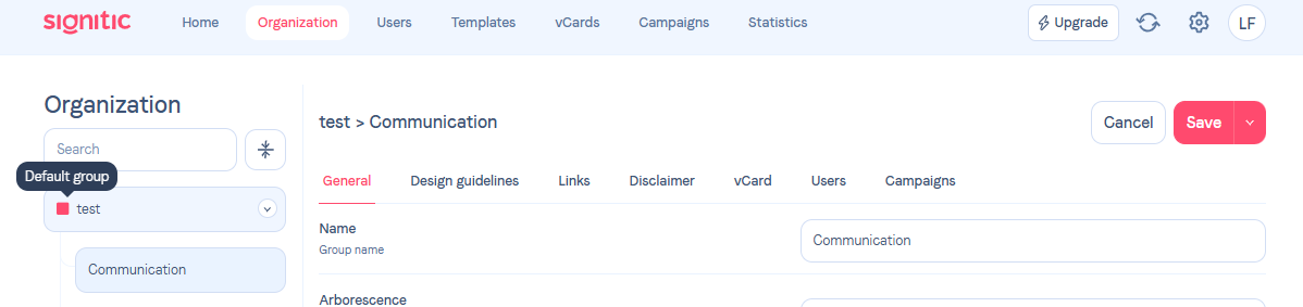 Set a default groupTo carry out this action, you can go to the Organization tab in Signitic.