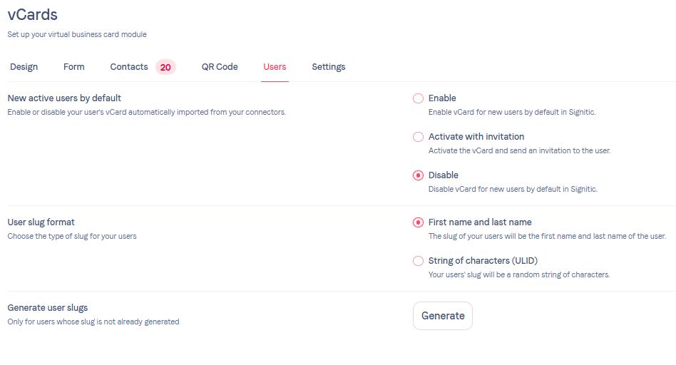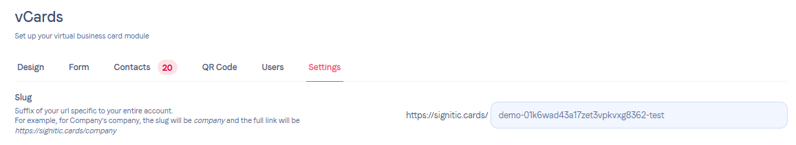 Once the module's active, you'll be able to manage your vCards slug from the Settings sub-tab. For example: https://signitic.cards/mycompany