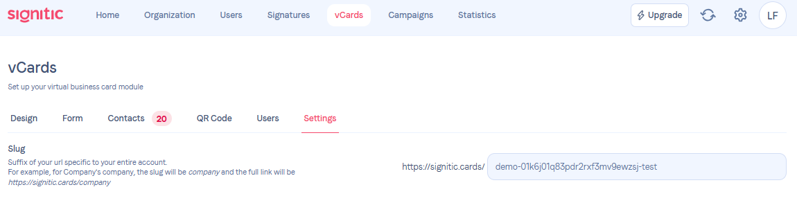 To activate the company section, go to the settings tab then the Vcard tab. Fill in the "Slug" field with your company name as shown in the example.