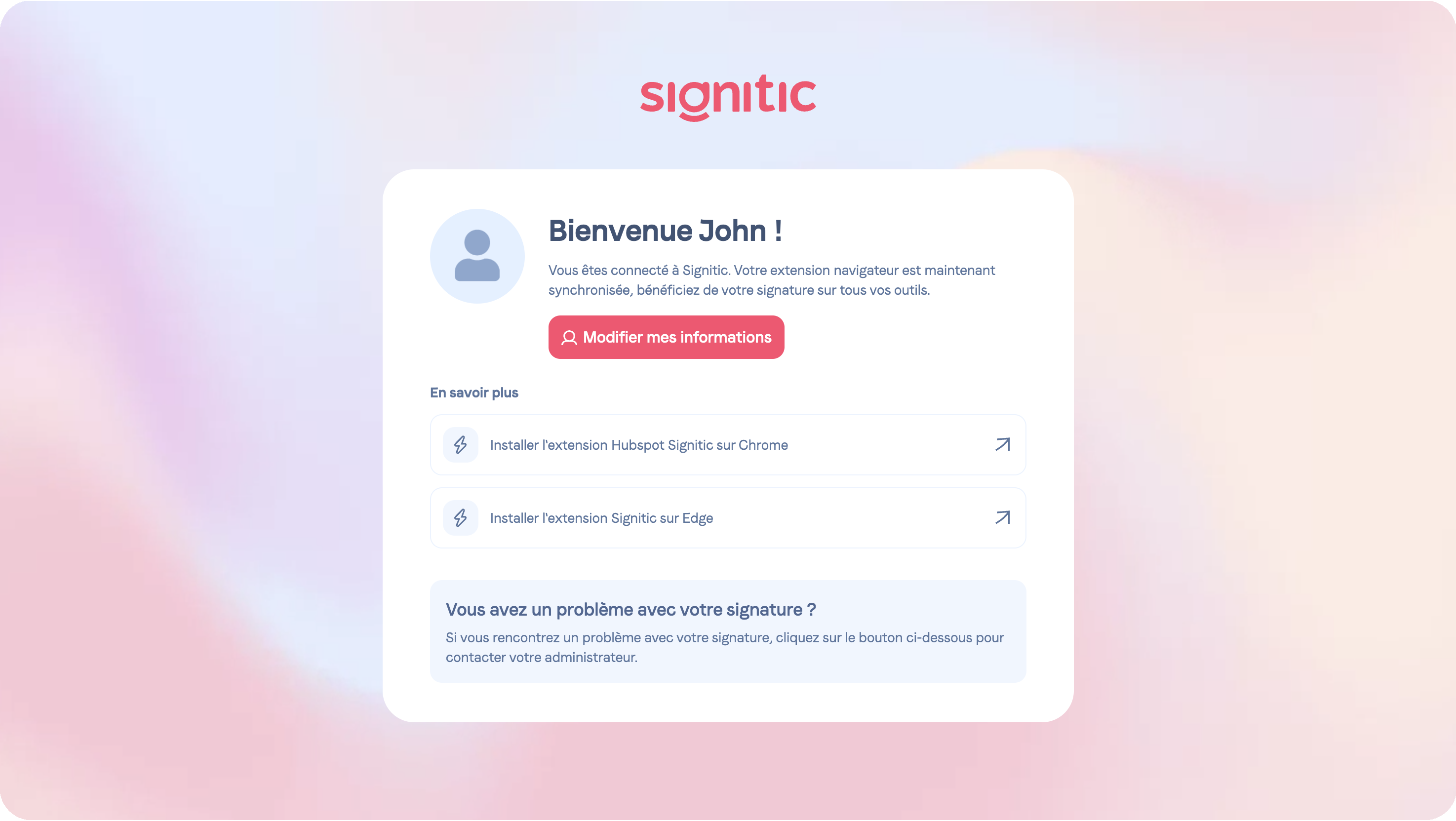 After clicking the button, your signature will be in place, and you will see the different applications connected to your extension.
