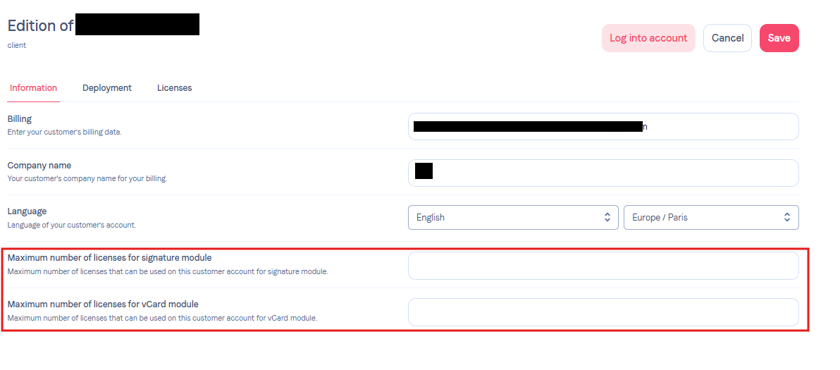 Once that’s done, in the Information tab you can set a license limit as you like. This can be for signatures, but also vCards.