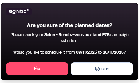 An intelligent reminder regarding campaign attributionYour assistant automatically detects campaigns that are incorrectly assigned or without links. It proactively alerts you so your communication does not go unnoticed. This reminder is integrated directly into your Signitic interface, in the form of a clear and actionable suggestion.
