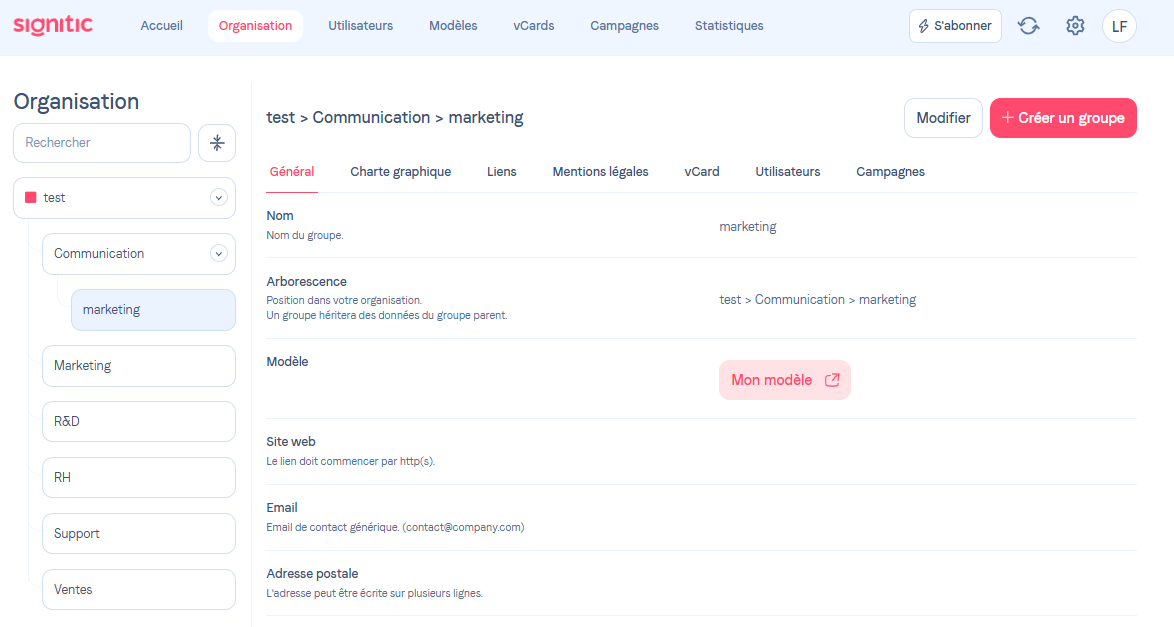 Afin d’automatiser au maximum Signitic, nous vous conseillons de remplir au préalable toutes les informations relatives à votre Groupe principale afin que la notion d’héritage puisse s’appliquer dans vos groupes de niveau 2 et 3.