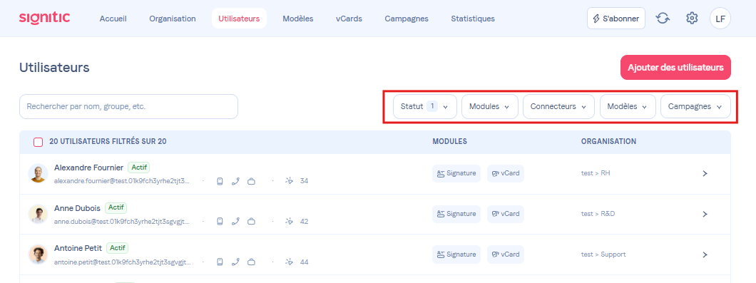 Pour réaliser des actions groupées sur vos utilisateurs ou bien vérifier des données, vous pouvez filtrer la page utilisateurs selon certains critères disponibles en haut de la page.