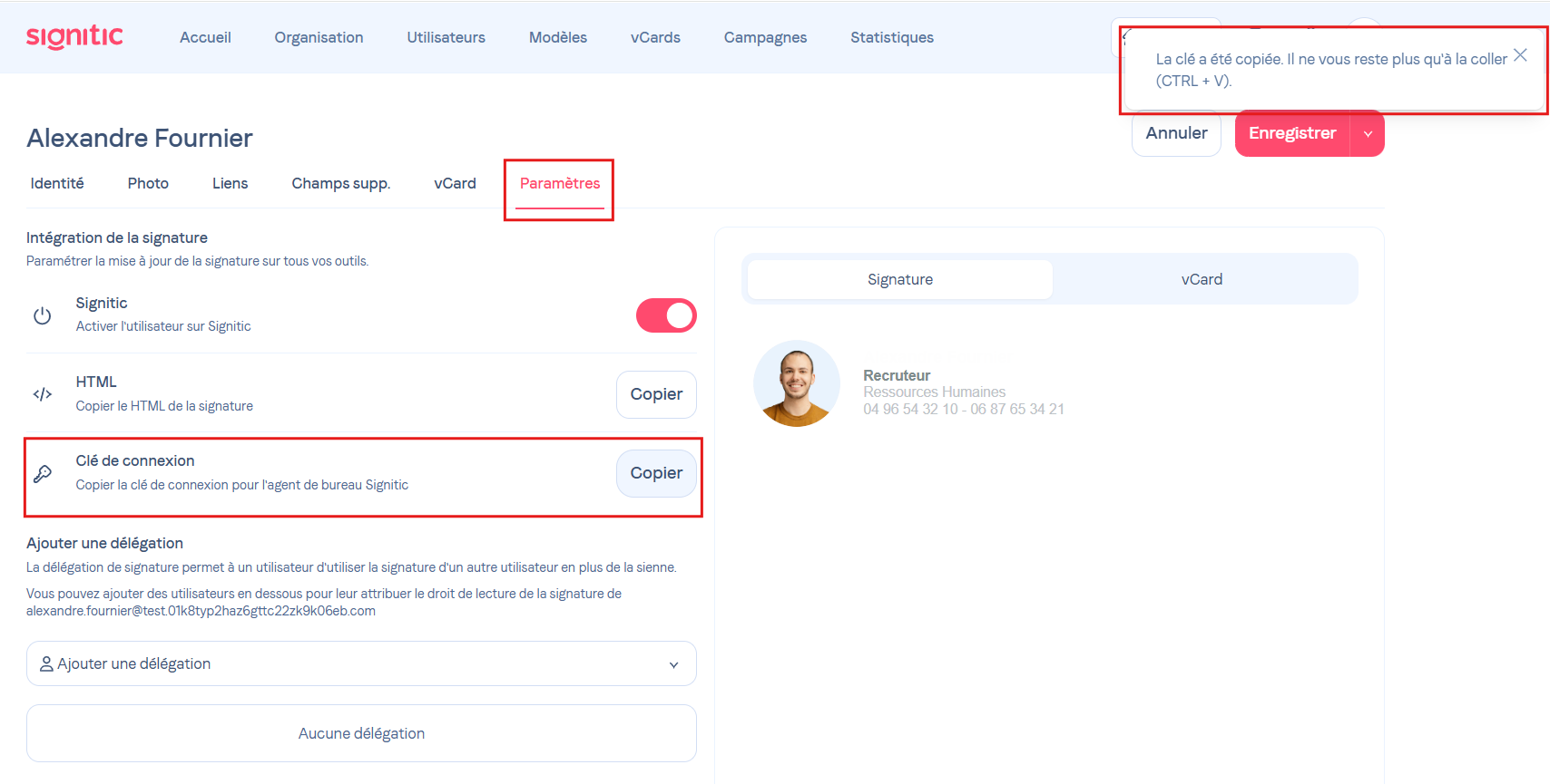 La clé de connexion d'un utilisateur lui permet de modifier son formulaire personnel ainsi que de se connecter à l'application de bureau Signitic.