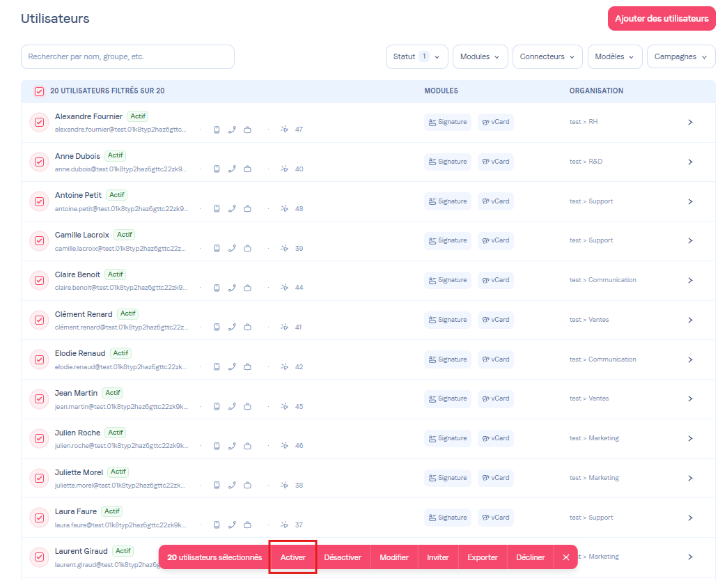 Rendez-vous dans le menu UtilisateursAccédez au menu Utilisateurs, puis sélectionnez vos utilisateurs à l'aide des cases à cocher à gauche de chaque utilisateur ou bien triez-les avec les filtres disponibles en haut de la page.