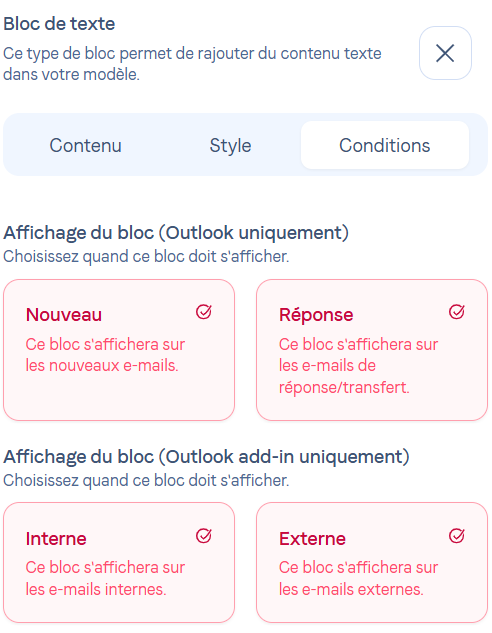 Si vous utilisez Outlook vous avez le choix de faire apparaître ou non vos icônes lors d'un nouveau message ou d'une réponse à un email. Vous pouvez également choisir selon le type d'email (interne/externe).