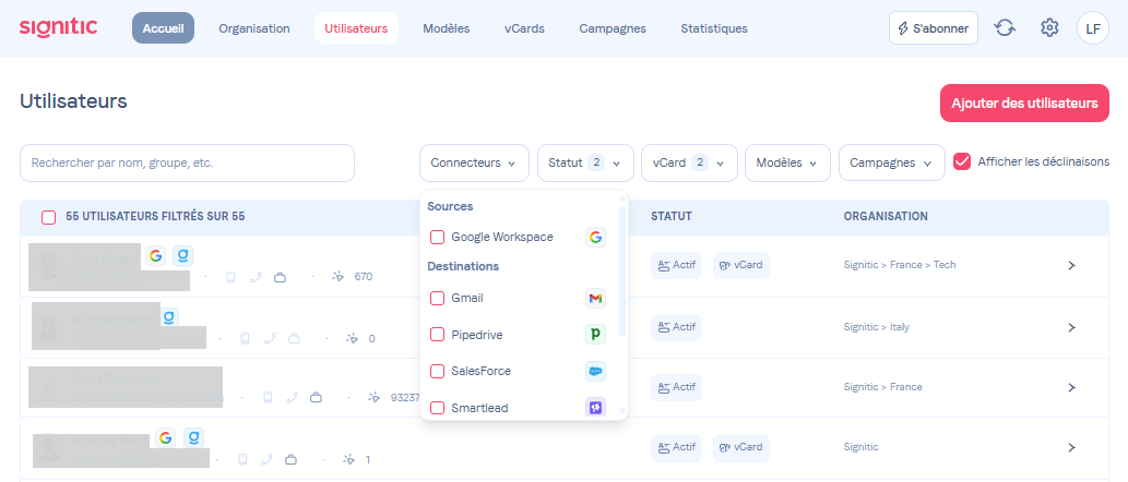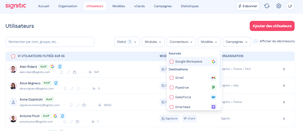 👉🏻 Vous avez aussi la possibilité de filtrer les utilisateurs connectés à l'agent ou à l'Add-in avec le filtre Connecteur en haut de la page.