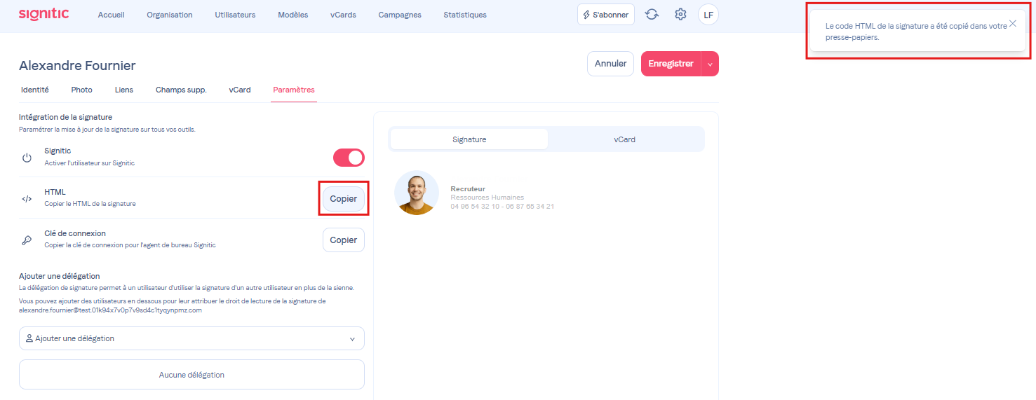 Il vous suffit de cliquer sur le bouton Copier : Un message de confirmation s'affichera en haut à droite de votre écran.