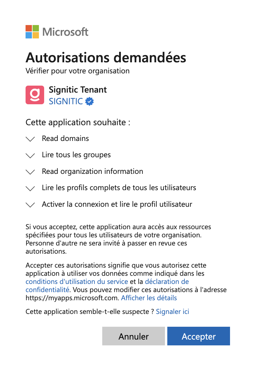 Les autorisations demandées sont utilisées pour récupérer la liste de vos utilisateurs et de leurs attributs.