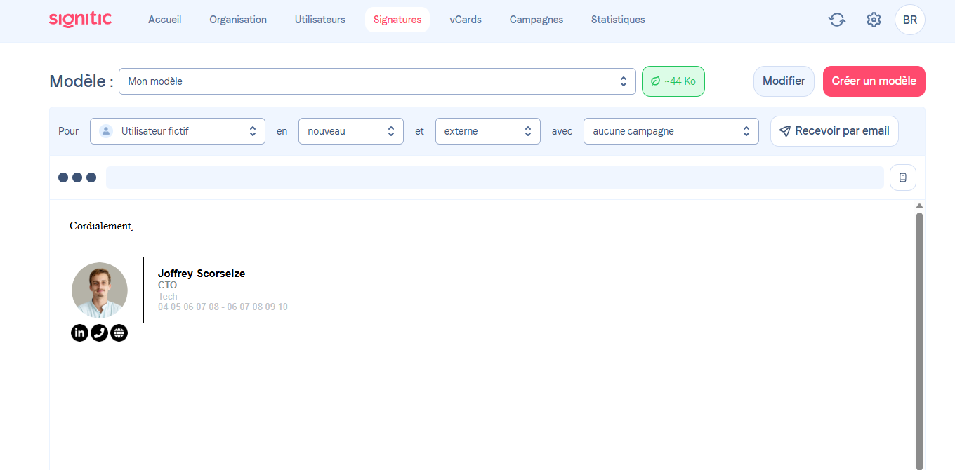 Depuis le menu Signatures, choisissez le modèle de signature souhaité puis cliquez sur Modifier.