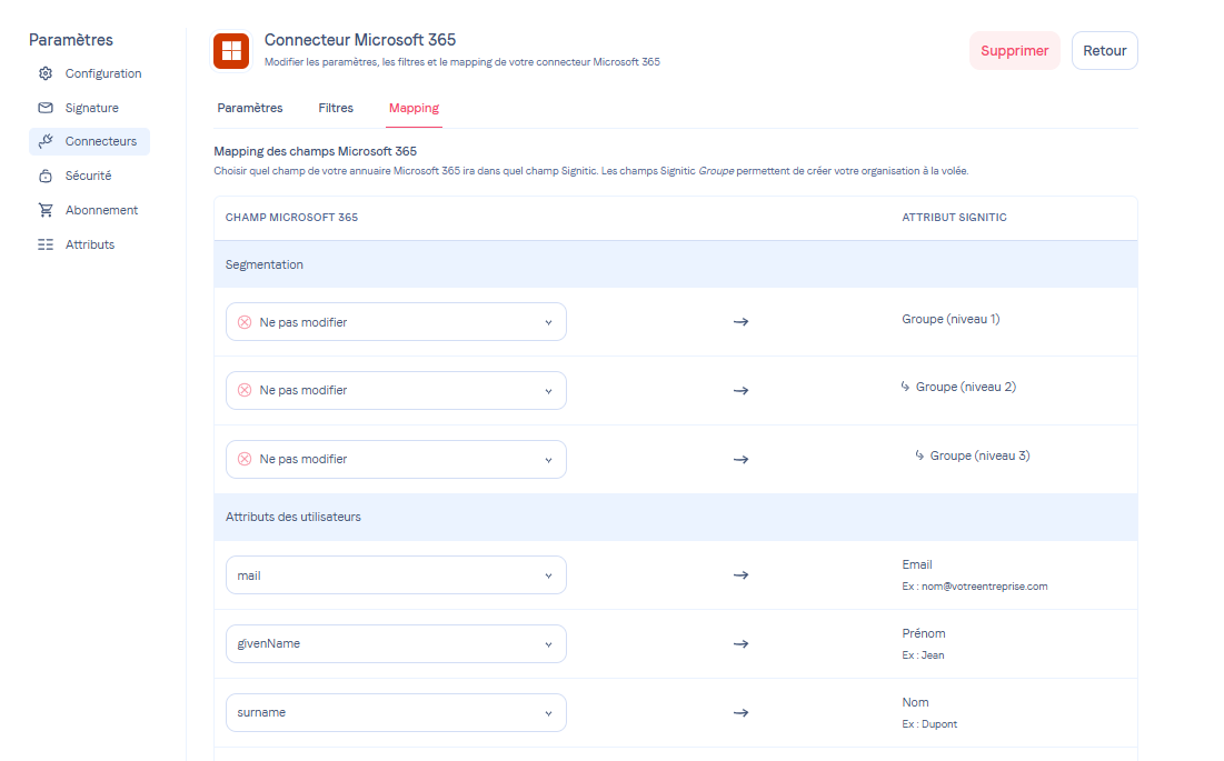 Si vous disposez d'un connecteur Microsoft 365 ou Google Workspace, vous avez accès à un onglet Mapping dans les paramètres du connecteur.