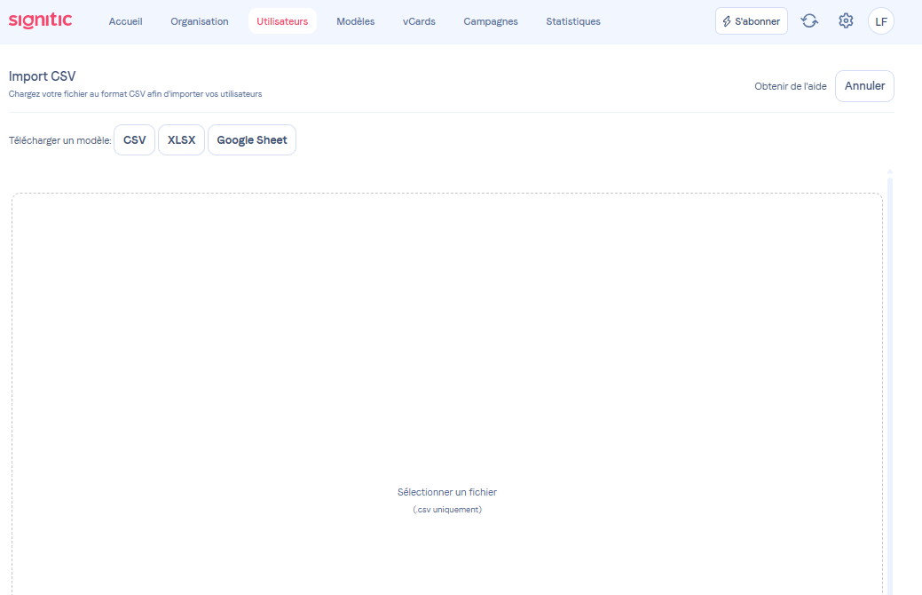 Importez vos utilisateurs depuis un fichier CSV : il vous suffit de télécharger votre fichier (CSV, XLSX, Google sheet).