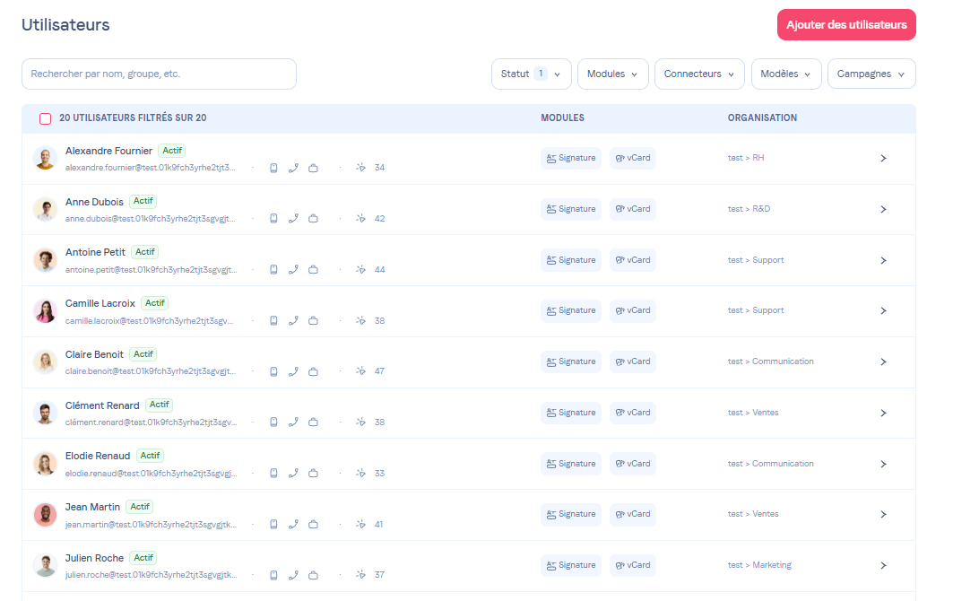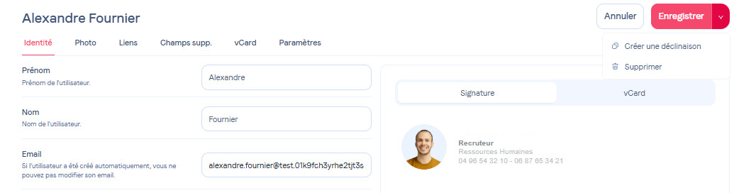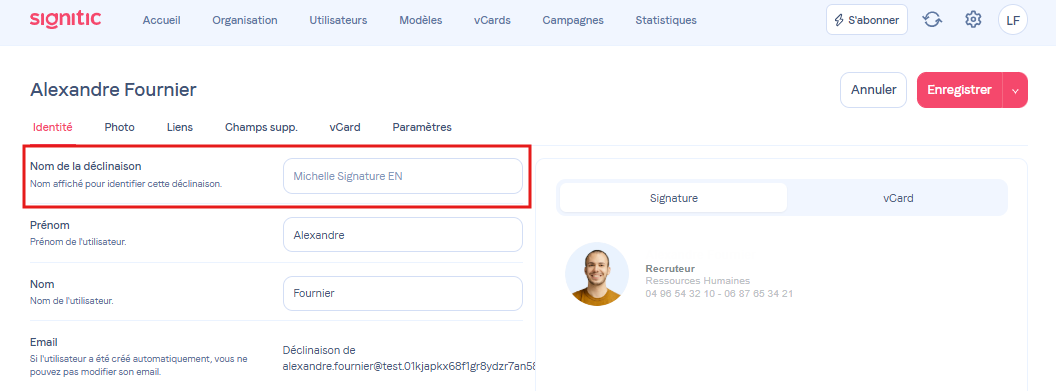 Vous pouvez créer des variantes (déclinaisons) de vos utilisateurs depuis Signitic.
