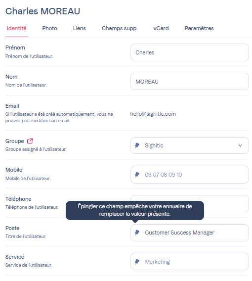 Quand votre compte est complètement synchronisé avec votre annuaire et que l'option réécriture des données est active, vous avez la possibilité de rendre certains champs non assujettis à la mise à jour quotidienne des informations de vos utilisateurs.