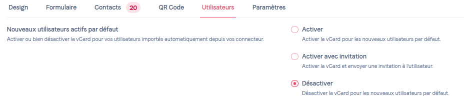 Il est aussi possible d'activer la vCard par défaut pour vos utilisateurs, grâce à cette option depuis l’onglet Utilisateurs.