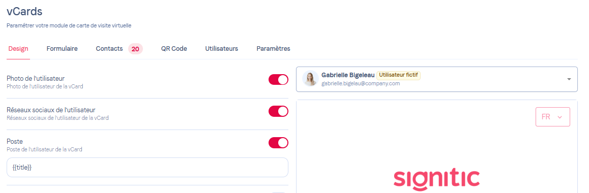 Rendez-vous cette fois-ci dans l'onglet "Utilisateurs", puis dans "vCard" vous y trouverez l'option vCard Signitic, il vous suffit de la cocher pour activer la vCard.